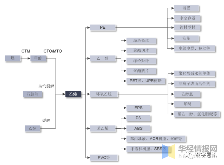乙烯生产工艺流程可分为三类:煤制烯烃(CTO/MTO)、石脑油蒸汽裂解、乙烷裂解。乙烯下游产品包括聚乙烯(PE)、乙二醇、环氧乙烯、苯乙烯、聚氯乙烯(PVC)等,这些衍生物的主要下游产品有塑料、纤维、橡胶等合成材料以及表面活性剂、黏合剂、涂料等,最终应用于包装、农业、建筑、电子电器、机械和汽车等行业。