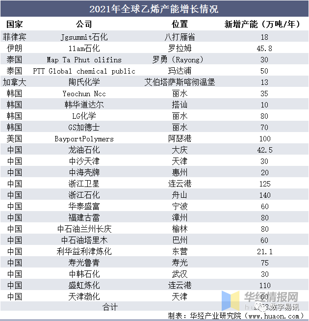 据统计,2021年全球新增乙烯产能达1385.4万吨/年,新增乙烯产能的67%来自中国;韩国一批乙烯装置集中投产,新增乙烯产能近200万吨/年。2021年全球乙烯产能增长情况。